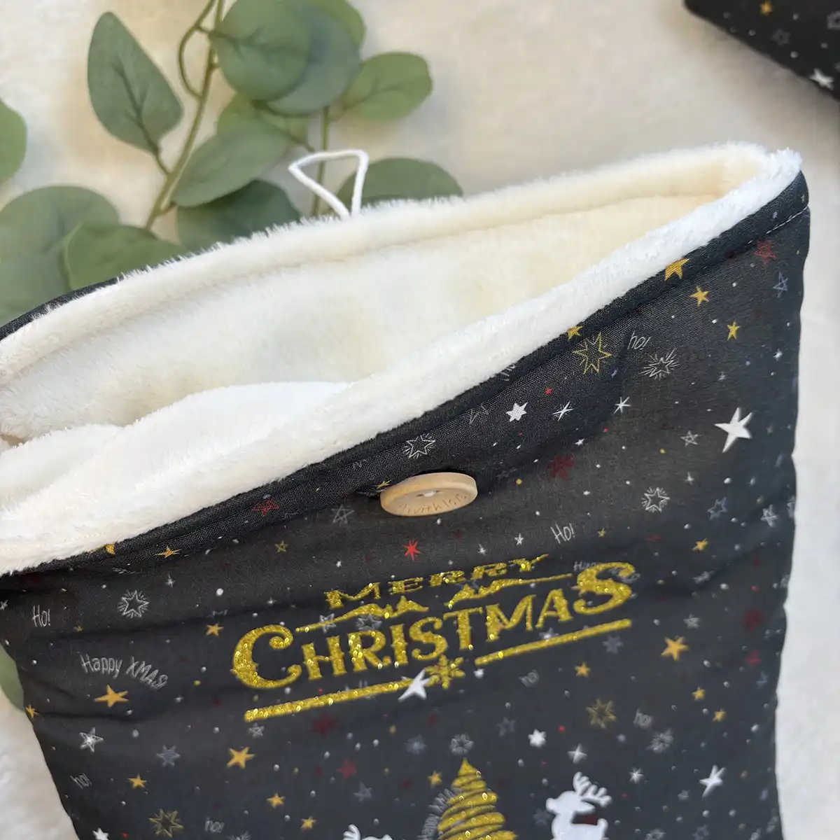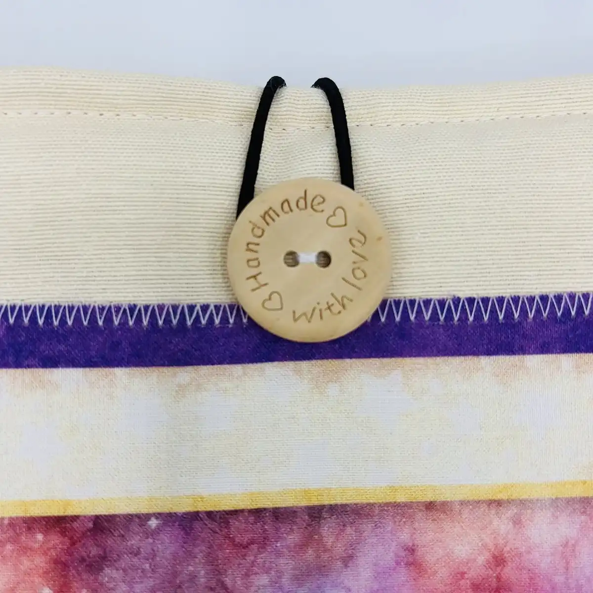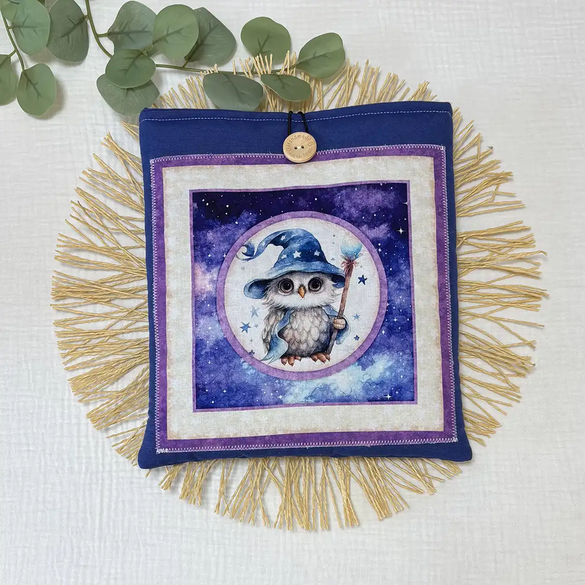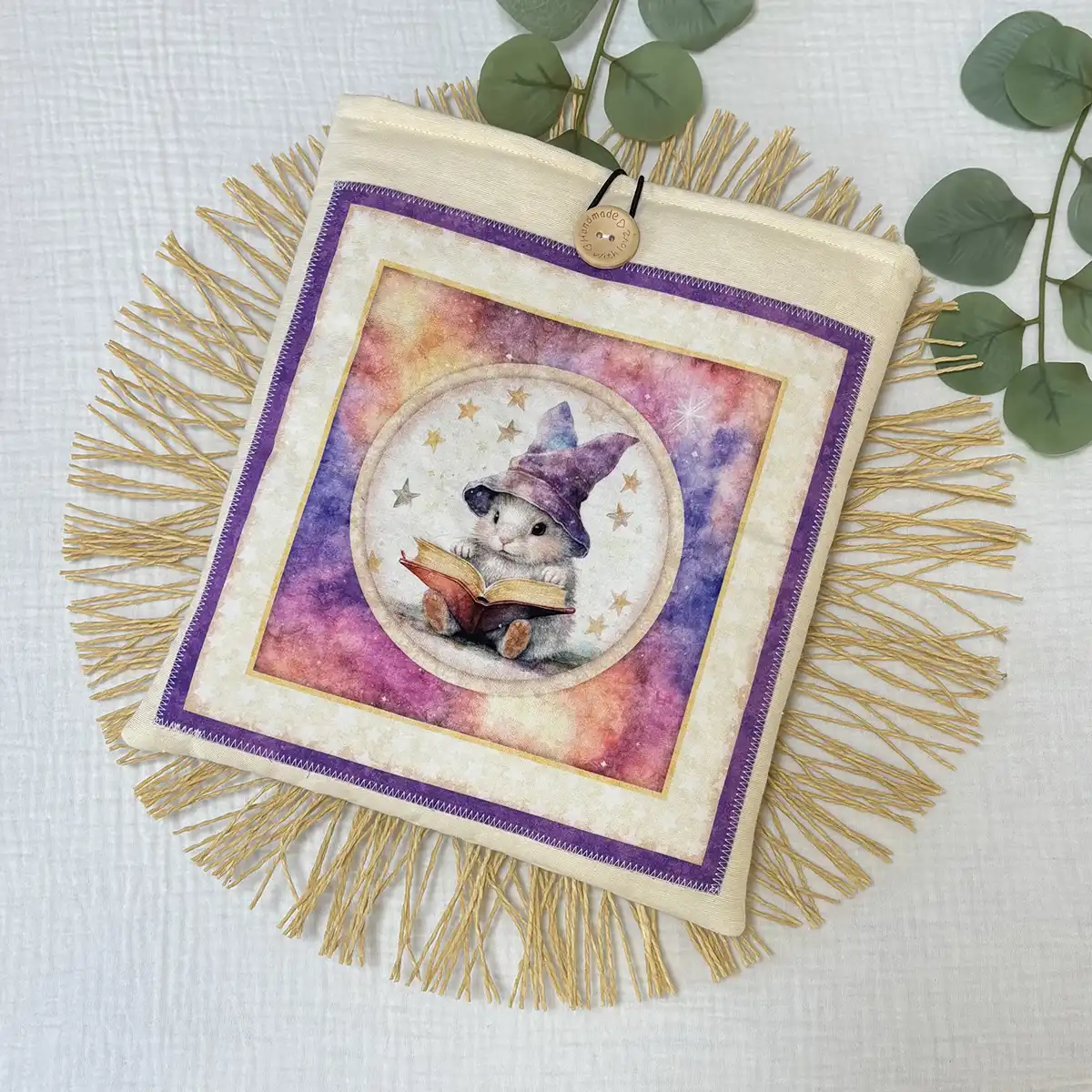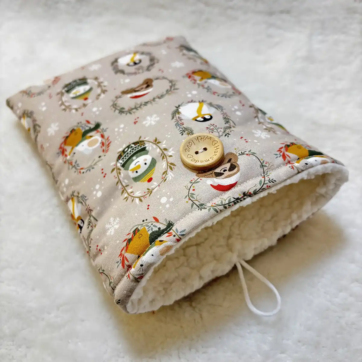 Funda acolchada de tela para saco de agua tamaño mediano, hecha a mano en algodón color crema, con cierre de botón de madera grabado y forro interior protector.